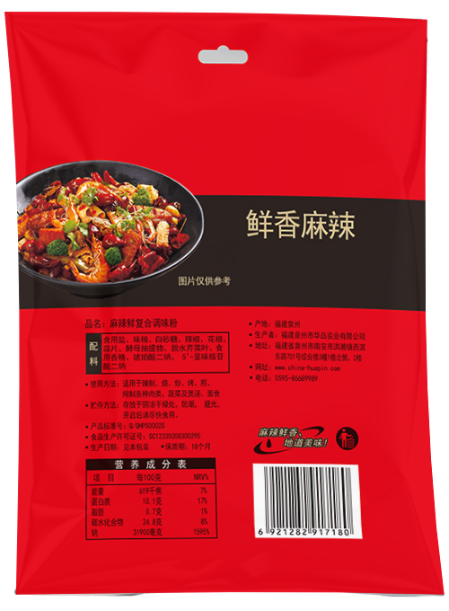 食盐、味精、白砂糖、辣椒、花椒、蒜片、酵母抽提物、脱水芹菜叶、食用香精、琥珀酸二钠、5’-呈味核苷酸二钠